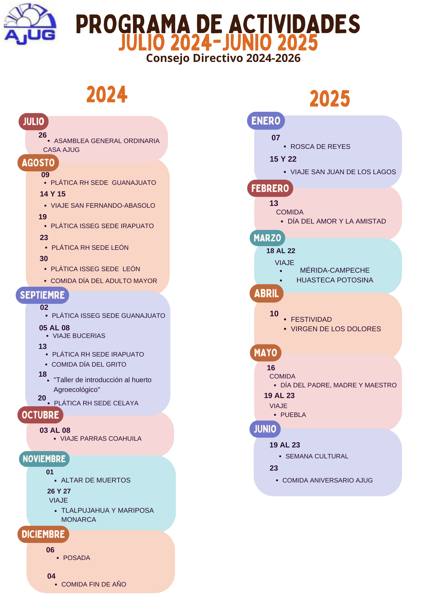 La AJUG tiene como objetivo contribuir al mejoramiento sustancial de la calidad de vida de los jubilados de la Universidad de Guanajuato, mediante actividades sociales, artísticas y culturales, así como a través de la protección de sus intereses.