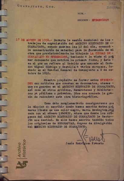 Colección formada por el Mtro. Jesús Rodríguez Frausto, primer director del Archivo Histórico de la Universidad de Guanajuato, como producto de las investigaciones históricas que dieron origen y sustento a la serie Biografías, primer órgano de divulgación del Archivo Histórico de la Universidad de Guanajuato. Los 122 números que componen la serie, fueron publicados entre 1955 y 1961. Cada uno está dedicado a un personaje relacionado con la historia o la cultura de la entidad, desde el caudillo Miguel Hidalgo y Costilla, los intelectuales José María Luis Mora y Lucas Alamán o el músico Juventino Rosas, hasta algunos guanajuatenses que en distintas épocas contribuyeron a la política, la ciencia y el arte local o regional como doña Josefa Teresa de Busto y Moya, benefactora del antiguo hospicio y colegio jesuita, el aeronauta Benito León Acosta, el pintor Hermenegildo Bustos o el presbítero e historiador Lucio Marmolejo, entre otros.
