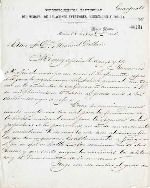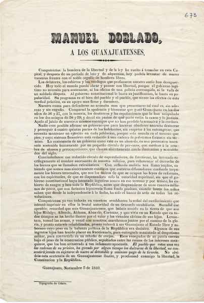 Manuel Doblado Partida (1818-1865), abogado egresado del antiguo Colegio, hoy Universidad de Guanajuato, Ministro de Relaciones Exteriores y gobernador de los estados de Guanajuato y Jalisco. Defensor de los principios liberales, participó activamente en la Guerra de Reforma y en la defensa del país durante la intervención francesa. La documentación que se conserva, corresponde a las diferentes actividades desarrolladas desde su etapa como estudiante hasta el momento que ocupó el ministerio de Relaciones Exteriores bajo las órdenes del presidente Benito Juárez. Se trata de información sobre asuntos que atendió como abogado y la correspondencia establecida con familiares, amigos y personajes prominentes de la época, entre ellos: Juan Álvarez, Benito Juárez, Ignacio Comonfort, Guillermo Prieto, Ignacio Zaragoza, Antonio Haro y Tamariz, Santiago Vidaurri y Florencio Antillón, entre otros.