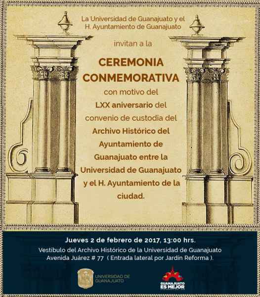 En el año 1947, ante la escasez de infraestructura física, recursos financieros y personal especializado en materia archivística, el Ayuntamiento de Guanajuato determina otorgar en comodato la documentación histórica contenida en el Archivo Municipal de la ciudad a favor de la Universidad de Guanajuato.