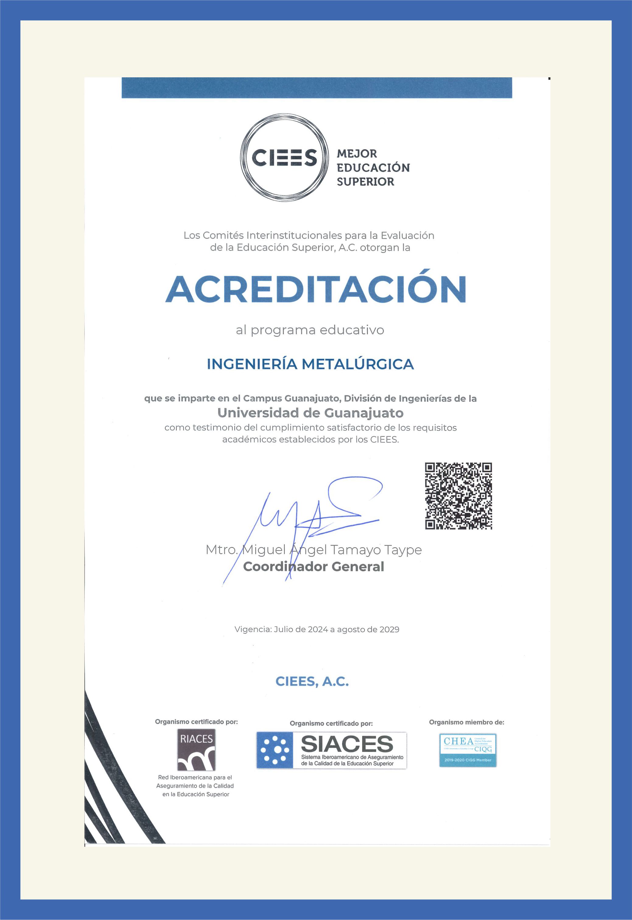 (modalidad escolarizada), Acreditación por cinco años, vigencia de julio de 2024 a agosto de 2029.