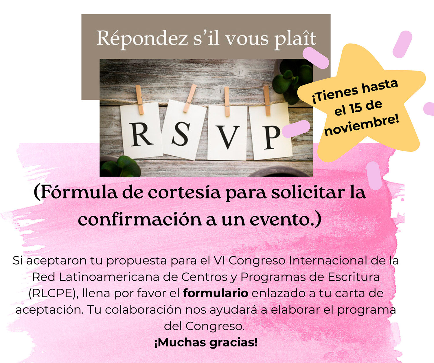Si aceptaron tu propuesta para el VI Congreso Internacional de la Red Latinoamericana de Centros y Programas de Escritura (RLCPE), llena por favor el formulario enlazado a tu carta de aceptación. Tu colaboración nos ayudará a elaborar el programa del Congreso. ¡Tienes hasta el 15 de noviembre! ¡Muchas gracias! Más información