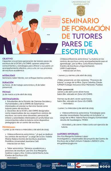 Objetivo: Capacitar a la primera generación de tutores pares de escritura de la DCSH y el CNMS, quienes adquirirán conocimientos y estrategias para ofrecer a sus pares un acompañamiento efectivo, uno a uno, en sus procesos de escritura académica.