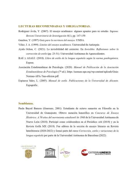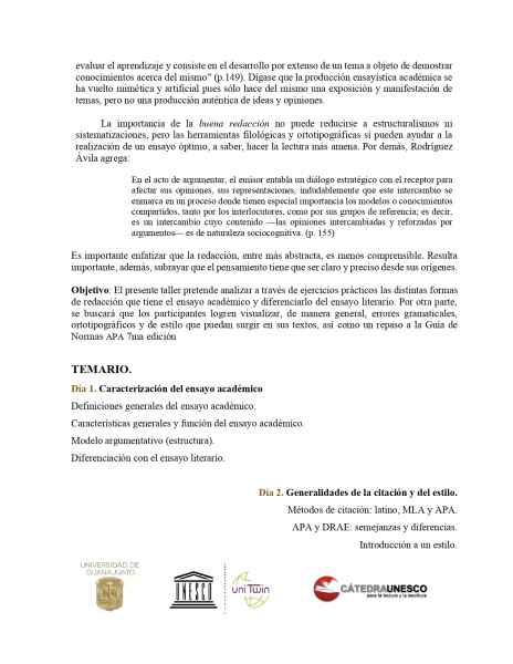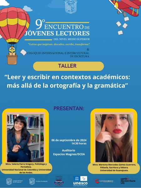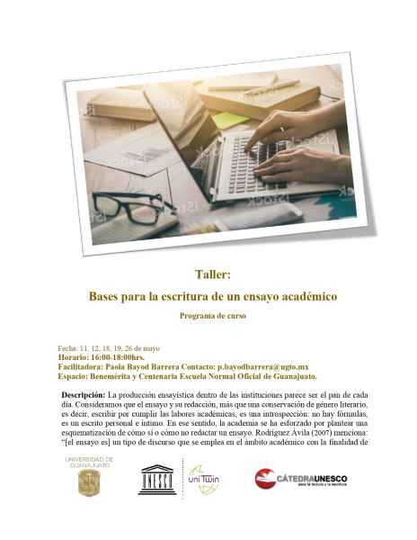Mayores informes: Dra. Eva Margarita Godínez López Investigadora y responsable del proyecto del Centro de Escritura de la Red UNITWIN / Cátedra UNESCO LEAL Esta dirección de correo electrónico está siendo protegida contra los robots de spam. Necesita tener JavaScript habilitado para poder verlo.