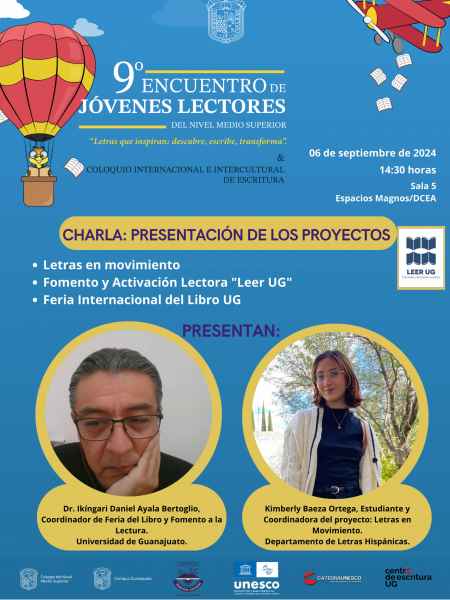 Charla; Presentación de los proyectos; "Letras en movimiento", Programa de Fomento y Activación Lectora "Leer UG" y Feria Internacional del Libro UG.