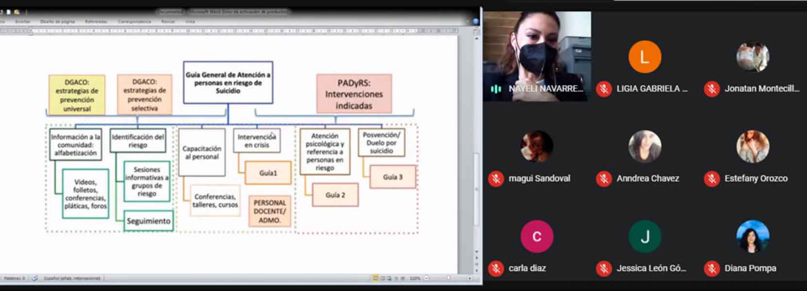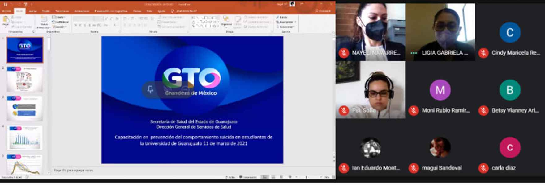 La capacitación fue programada por la plataforma Teams contando con la participación de 87 psicólogas y psicólogos, algunos de los temas que se abordaron fueron: estadísticas en el estado de Guanajuato; los mitos y realidades del suicidio; los diferentes niveles de riesgo y las acciones que se pueden implementar, entre ellas la elaboración conjunta de un plan de seguridad.