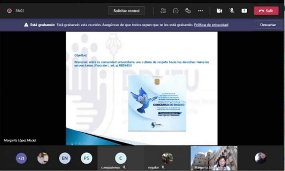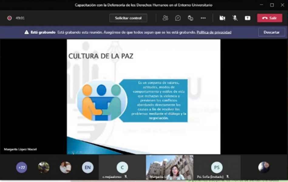 La capacitación fue programada por la plataforma Teams teniendo la participación de 31 asistentes, algunos de los temas que se abordaron fueron los derechos humanos, cultura de la paz, violencia universitaria, los servicios que ofrece la defensoría de derechos humanos en el entorno universitario y como poder solicitarlos, entre otras cosas.