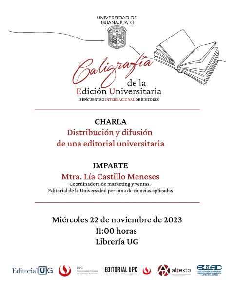 El intercambio de reflexiones sobre la edición del libro académico: Caligrafía de la edición universitaria tendrá un II Encuentro Internacional de editores, los próximos 22 y 23 de noviembre de 2023 en la Librería UG con la presencia de dos destacados profesionales del libro y la edición universitaria: la Mtra. Lía Castillo Meneses, coordinadora de marketing y ventas de la Editorial de la Universidad Peruana de Ciencias Aplicadas, y del Dr. Edgar García Valencia, Miembro del Sistema Nacional de Investigadores, Nivel I. Investigador del Centro de Estudios de la Cultura y la Comunicación de la Universidad Veracruzana. Fue Director de la Editorial Universidad Veracruzana.