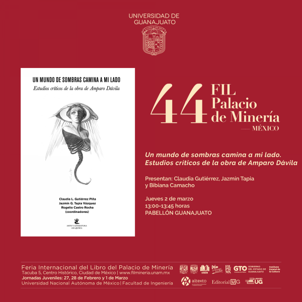 Un mundo de sombras camina a mi lado. Estudios críticos de la obra de Amparo Dávila. conjuga una serie de acercamientos a la obra de la escritora en los que se someten a revisión los universos de lo fantástico y el terror que la particularizan, así como los tópicos que articulan la visión de realidad delineada tanto en su narrativa como en su poesía: la angustia, la soledad, el delirio, el sueño. La presentación tendrá lugar el jueves 2 de marzo a las 13:00 horas en el Pabellón Guanajuato