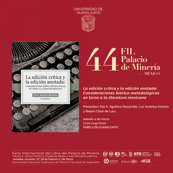 La Edición crítica y la edición anotada: consideraciones teorico-metodológicas en torno a la literatura mexicana. Consideraciones teórico-metodológicas en torno a la literatura mexicana reúne seis artículos de distintos especialistas de la edición crítica y la edición anotada de nuestro país, se presentará el sábado 4 de marzo a las 11:00 horas en el Pabellón Guanajuato con la presencia de Flor E. Aguilera, Luz América Viveros y Belem Clark de Lara.