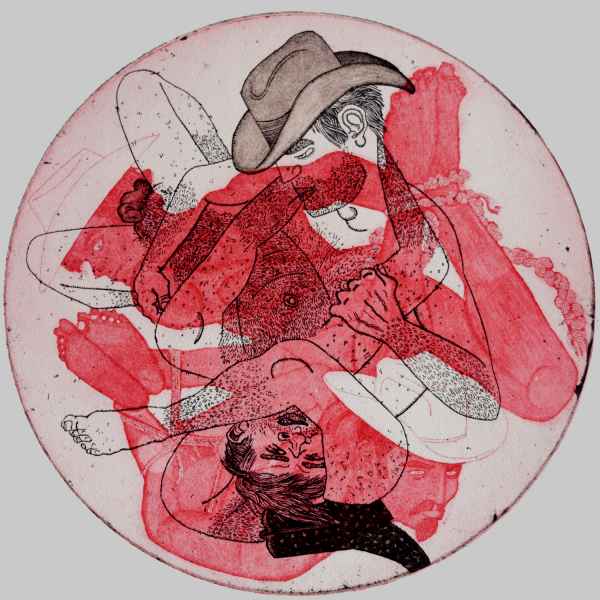 Para la exhibición en la Universidad de Guanajuato, Ron Abram exhibirá su serie de grabados “Wrangler”. Estos huecograbados de cobre "Tondi" (forma circular) se basan en materiales históricos de origen erótico gay para no solo explorar las relaciones sexuales íntimas, sino también ofrecer comentarios sobre las dinámicas de poder, los roles de género y la masculinidad tóxica en nuestro panorama político estadounidense actual. Los estampados son composiciones coreografiadas de vaqueros inspiradas en gran medida en las physique magazines producidas por y para hombres homosexuales en la década de 1950. Revistas como Physique Pictorial producida por Bob Mizer celebraron la cultura del culturismo y la figura del arte clásico haciéndose pasar por un medio queer con el cual compartir imágenes masculinas homoeróticas y evadir las acusaciones de obscenidad. Para Guanajuato, Abram ha explorado aún más los mitos y estereotipos populares al incluir representaciones de vaqueros mexicanos que históricamente inspiraron al vaquero estadounidense. Al hacerlo, el trabajo explora una danza Queer imaginada a través de nuestras fronteras.