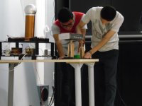 In the category of Electromagnetism and Waves, they presented several experiments such as "Faraday's Experiment" to understand the behavior of the electromagnetic fields; the "Solenoid motor" a device which uses electric energy to achieve a mechanical movement; the "Magnetic levitator" that diminishes the friction inside the mechanical systems, the "Van Graff Generator", an electricity device used to produce great voltages, as well as the "Electroscope" an instrument that determines the presence of electrical charges.
