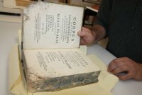 He exemplified there is a book of Hypocrites with decay by blood stains, which infers it was possibly used in a surgery process, perhaps the medic had it with him at that moment and, although the stain could be removed with washing processes, it is not done since it is an evidence of its history.