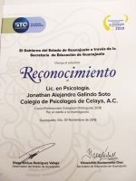 Celaya, Gto., December 6, 2018.- The Government of the state of Guanajuato, through the Ministry of Education, recognized Dr. Jonathan Alejandro Galindo Soto, professor at Campus Celaya-Salvatierra of the University of Guanajuato, as a distinguished collegiate professional 2018, for his contributions within the field of psychology, particularly for his research on "Psycho-emotional needs of the elderly hospitalized in the public sector".