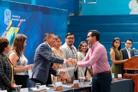At the ceremony the letters of congratulations and pennant were given to the beneficiaries, who were represented by Daniel Alejandro Ledesma Pérez, student of Biomedical Engineering, who will travel to California, and by Perla Aranza Sandoval Sánchez, from the Bachelor of Public Administration, who will travel to Canada.