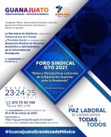 Guanajuato, Gto., a 18 de marzo de 2021.- Organizado por la Secretaría de Gobierno del Estado de Guanajuato, a través de la Subsecretaría del Trabajo y Previsión Social y en coordinación con la Asociación Sindical de Personal Académico y Administrativo de la Universidad de Guanajuato (ASPAAUG), los próximos 23, 24 y 25 de marzo de 2021 se llevará a cabo el Foro Sindical GTO 2021.