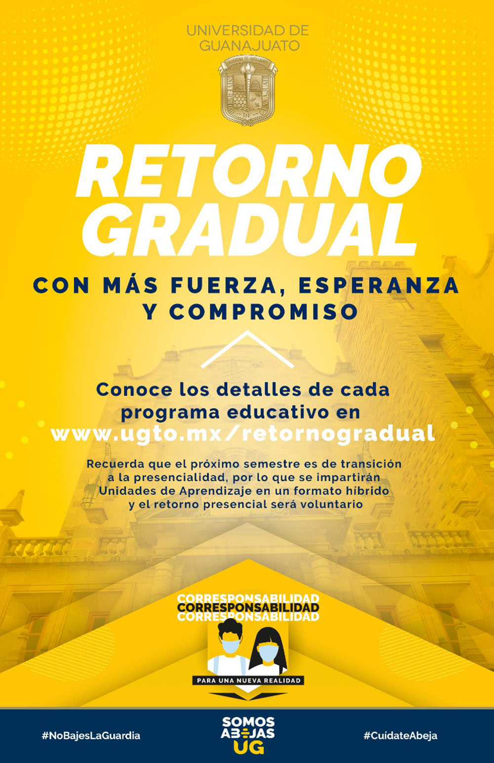 Así, el ciclo agosto-diciembre 2021 será un semestre de transición, un escenario inédito en la Casa de Estudios, por lo cual se ha determinado concentrar la información institucional referente al retorno a las actividades presenciales en el sitio www.ugto.mx/retornogradual.