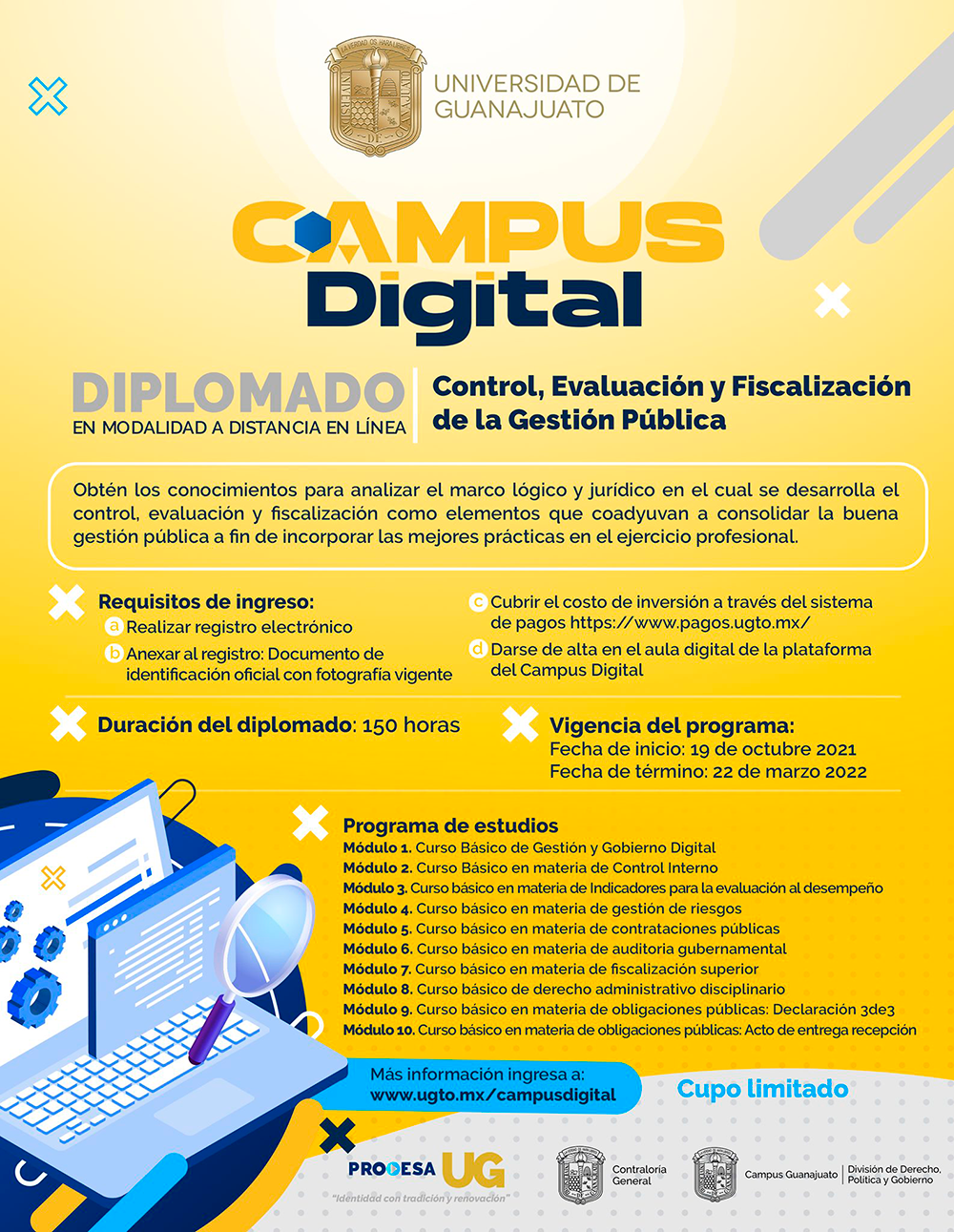 Guanajuato, Gto., a 11 de octubre de 2021.- La Universidad de Guanajuato, a través del Campus Digital, ofrece el Diplomado "Control, Evaluación y Fiscalización de la Gestión Pública", el cual está dirigido a personas servidoras públicas que formen parte de los equipos de trabajo de órganos internos de control, unidades de control, o cualquier organización análoga; aunque también pueden participar estudiantes de licenciatura.