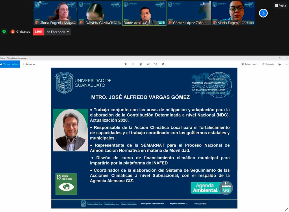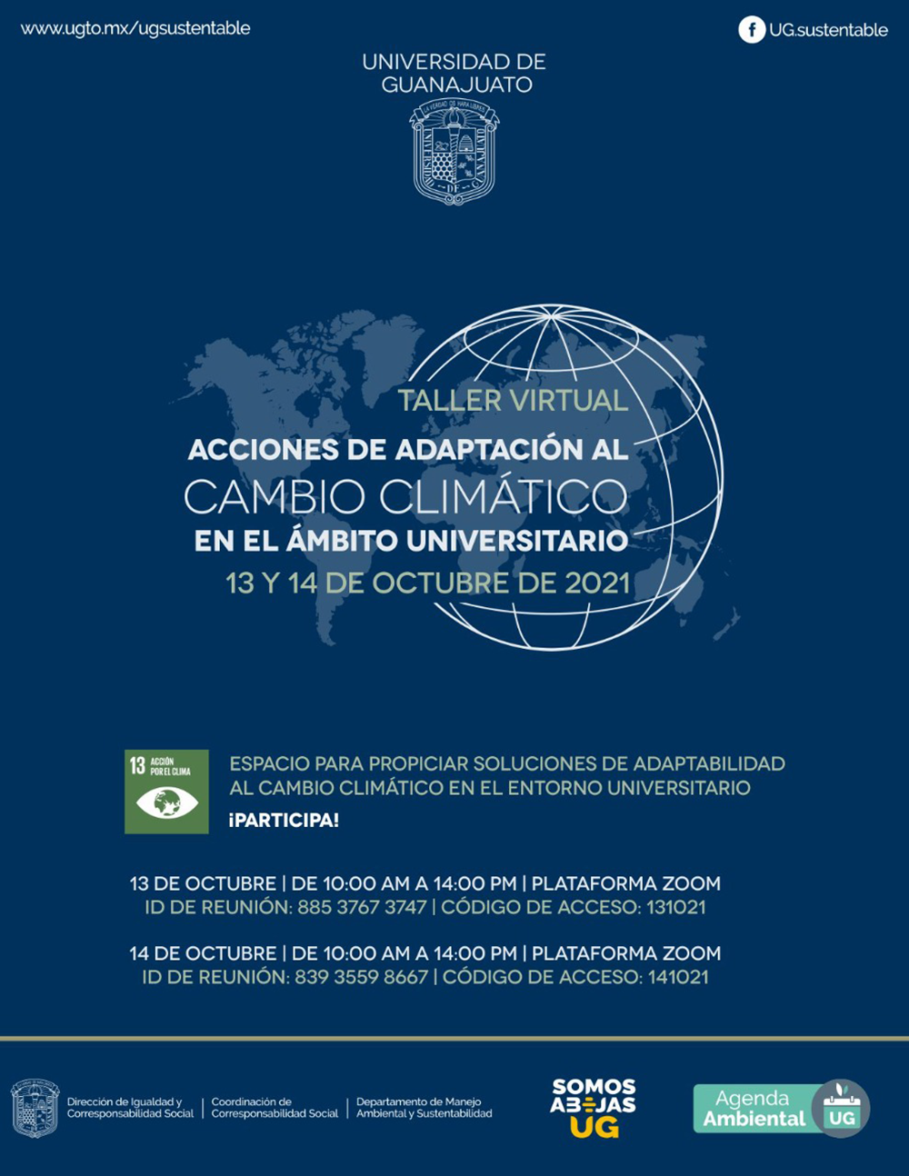 Guanajuato, Gto., a 13 de octubre de 2021.- Se llevó a cabo la inauguración del "Taller virtual de acciones de adaptación al cambio climático en al ámbito universitario", que organiza la Dirección de Igualdad y Corresponsabilidad Social de la Universidad de Guanajuato (UG) con el fin de capacitar y crear acciones de adaptabilidad en el marco del cambio climático.