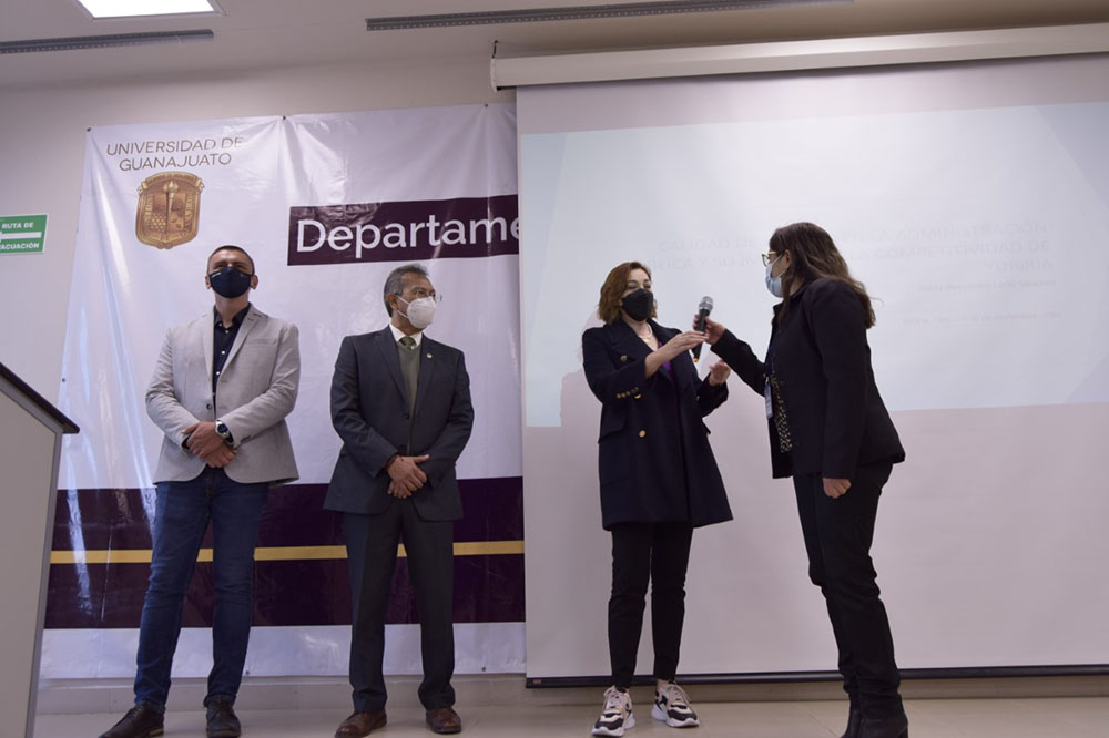 La Dra. León inició al describir los factores que determinan la categoría de Pueblo Mágico, como es Yuriria. Luego explicó como el liderazgo, el compromiso organizacional y los recursos humanos coadyuvan en la calidad de la administración pública.