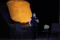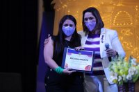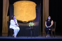 Al final de la interacción con la comunidad estudiantil, a Olimpia Coral le fue entregado un reconocimiento por su participación, así como una reproducción de la pintura de doña Teresa Josefa de Busto y Moya, la principal benefactora de lo que hoy es la Universidad de Guanajuato.