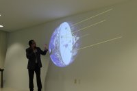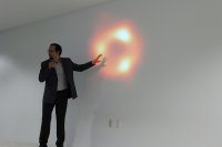 Mostró la imagen de la primer indicación de que se tenía un agujero negro en nuestra galaxia con grupo de estrellas rotando, luego mostró unas imágenes de la constelación de Sagitario, de los telescopios en diferentes países y de la imagen final obtenida con datos capturados en abril del año 2017.