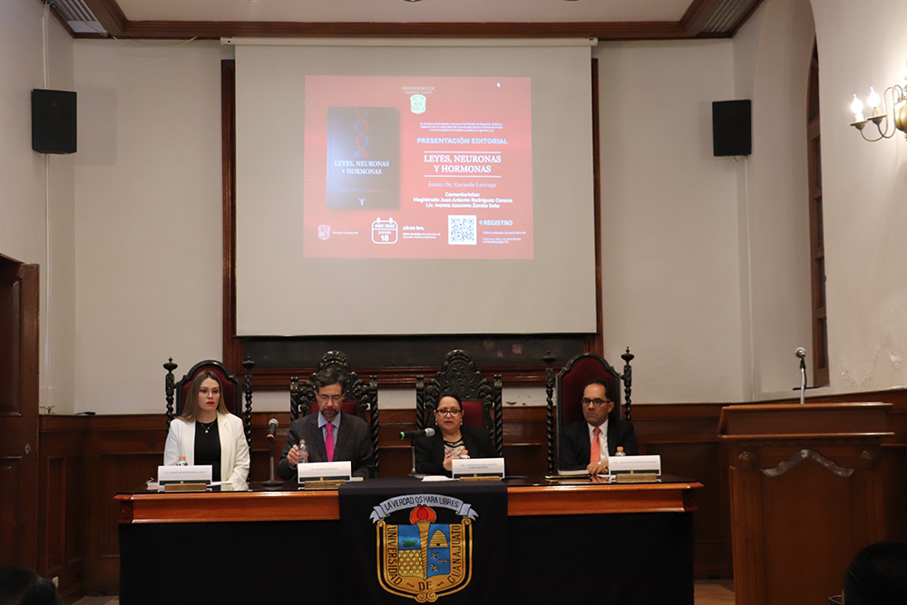 Guanajuato, Gto., a 24 de agosto de 2022.- El Campus Guanajuato de la Universidad de Guanajuato (UG), a través de la División de Derecho, Política y Gobierno (DDPG), presentó ante docentes y estudiantes, el libro "Leyes, neuronas y hormonas. ¿Por qué la biología nos obliga a redefinir el Derecho?", de la autoría del Dr. Gerardo Laveaga.