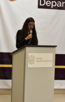 Durante el intercambio de experiencias, la Licenciada en Gestión Empresarial Yareli Mireles Moreno, dio su perspectiva como estudiante de la maestría; seguida por el Mtro. Erick Franco Gaona, estudiante del Doctorado en Ciencias de la Ingeniería, quien aportó su perspectiva como egresado de la MAT.