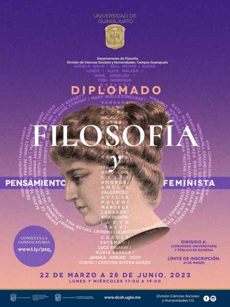 Guanajuato, Gto., a 21 de febrero de 2023.- Del 22 de marzo al 28 de junio, el Departamento de Filosofía de la División de Ciencias Sociales y Humanidades, en colaboración con la Coordinación de Igualdad y Corresponsabilidad Social del Campus Guanajuato de la Universidad de Guanajuato (UG), ofrecerá -a través de plataformas virtuales- el “Diplomado Filosofía y Pensamiento Feminista”, dirigido a la comunidad Universitaria y al público en general.