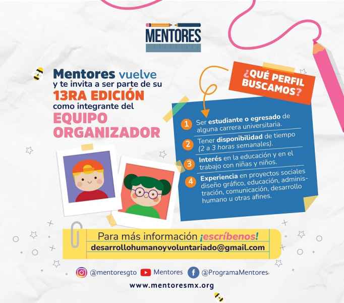 Por lo que la actual presidenta de Mentores, Andrea Monserrat, estudiante de la Licenciatura en Educación en la UG, hace un llamado a la comunidad universitaria activa o egresada del Campus Guanajuato, a sumarse a la edición número 13 de este programa para formar parte del equipo organizador, quienes serán las y los encargados de planear y llevar a cabo las actividades que el programa realiza.