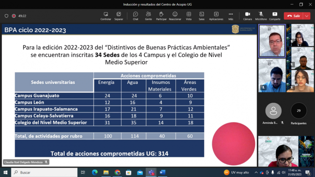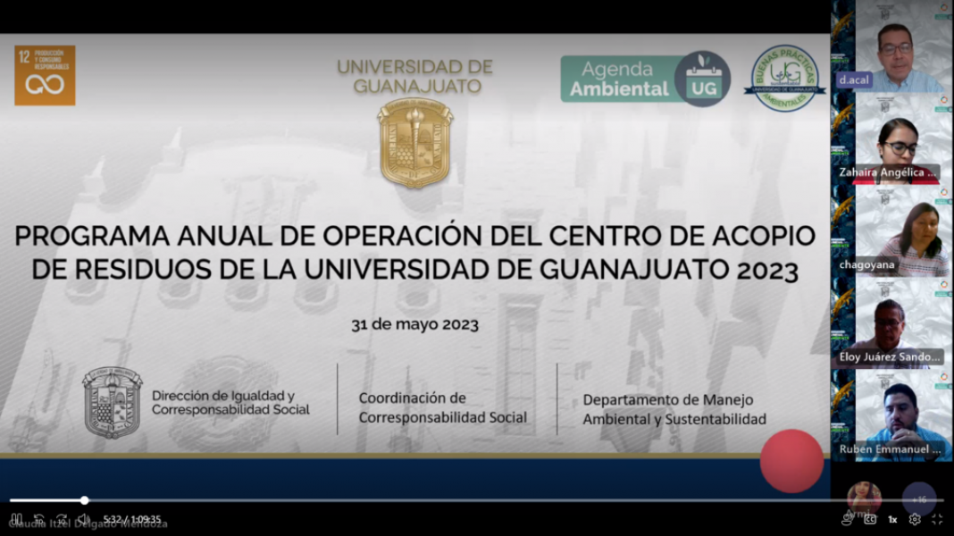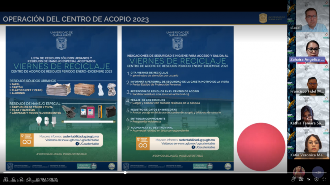 Se recordó el sistema de operación del “Viernes de Reciclaje”, sus beneficios y oportunidades de mejora. También se refirieron los resultados del programa de Buenas Prácticas Ambientales (BPA) UG, en donde destacan la participación de 34 sedes universitarias en el Distintivos de BPA edición 2022-2023, que otorga la entidad acreditadora ambiental del Estado de Guanajuato, en donde se encuentran comprometidas y en ejecución 314 acciones por la sustentabilidad UG, en materia de uso eficiente del agua y la energía, manejo de materiales y áreas verdes universitarias.
