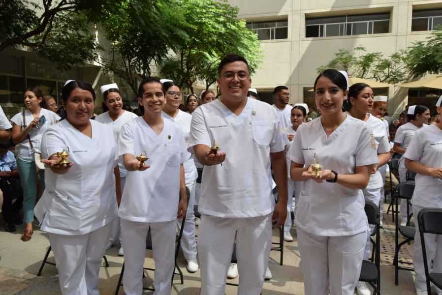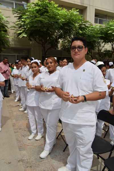 En el patio central de la División de Ciencias de la Vida de la Universidad de Guanajuato (UG) las profesoras y profesores comenzaron por colocar las cofias a las nuevas enfermeras, que representan el espíritu de servicio y vocación por convertirse en un profesional de la salud. A los enfermeros les colocaron fistoles de solapa como un distintivo a portar con orgullo en ocasiones solemnes.