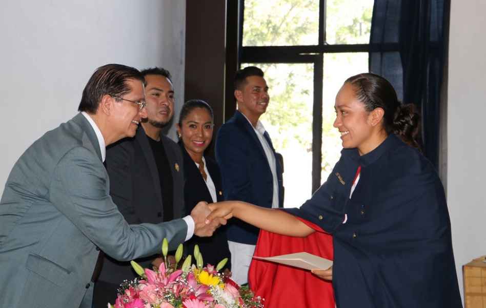 La alumna Viridiana Guerrero Jiménez, a nombre de sus compañeras y compañeros, hizo público su agradecimiento a sus padres, a las y los estudiantes de generación, así como a las y los profesores, pues cada uno de ellos fue parte del proceso para obtener este logro.