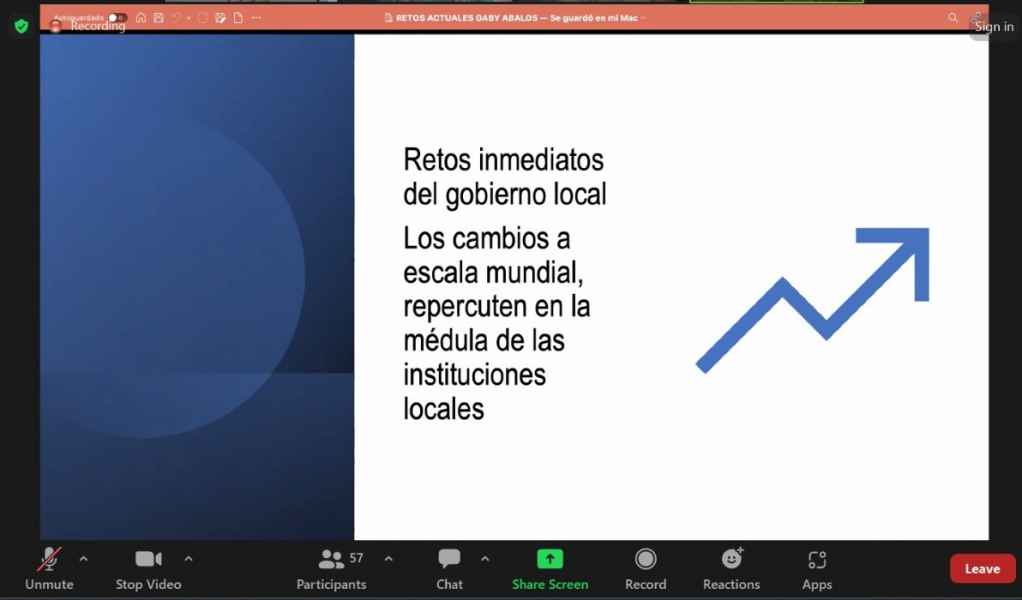 Esta actividad fue llevada a cabo de manera virtual, y la Dra. Rendón Huerta Barrera desarrolló el tema “retos actuales del gobierno local”. En este encuentro académico al que fue invitada, compartió foro con la y los prestigiados investigadores extranjeros: Dra. Diana Santiago Iglesias, Dr. Antonio María Hernández y el Dr. Néstor Oswaldo Losa.