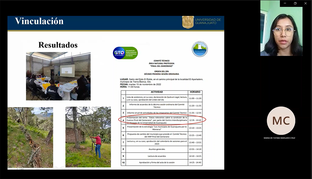 Su trabajo fue presencial en los ejidos El Cajón y El Roble, en la detección de enfermedades forestales, en coordinación con el Ayuntamiento de Tierra Blanca. Esta experiencia la motivó a seguir trabajando en el ámbito de la sustentabilidad.