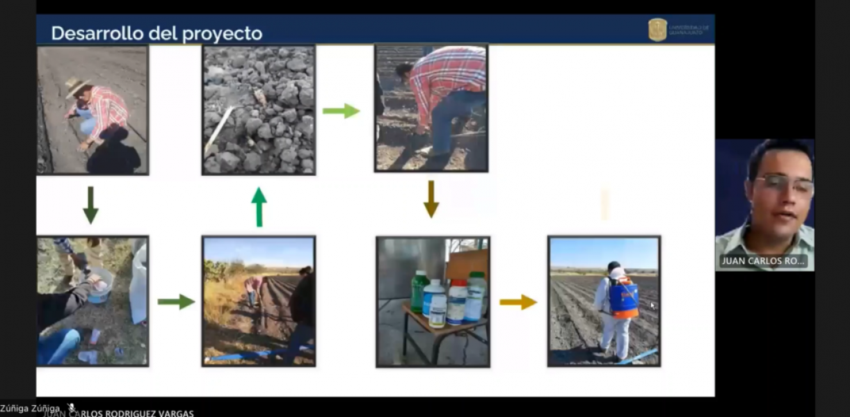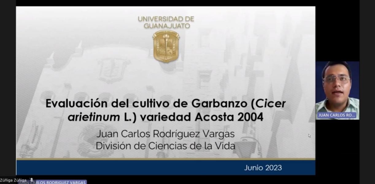 Juan Carlos Rodríguez Vargas, alumno de Ingeniería en Agronomía en la sede Irapuato, mostró los resultados del proyecto “Evaluación del Cultivo de Garbanzo (Cicer Arietinum L.) Variedad Acosta 2004” con asesoría de la Dra. Ana Martha Cruz Ávalos. El estudiante expuso como hizo la selección del sistema de riego, la preparación del terreno, la siembra y la resiembra debido a la presencia de roedores, el desmalezado, así como el control de plagas, aspecto que le enseñó a ser persistente ante ellas.