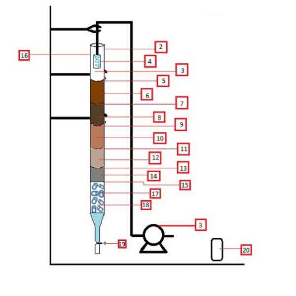 La patente, en la cual también incluyó la construcción de un prototipo para probar su efectividad, funciona mediante una columna dividida en dos secciones, en la cual ingresa el efluente que se busca descontaminar. En la primera sección se realiza un proceso de separación física, en el que se busca retener las partículas suspendidas del efluente por diferentes medios porosos. La segunda sección se enfoca en remover contaminantes, mediante una formulación química, utilizando una técnica de separación llamada líquido - líquido.