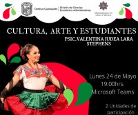 Además, el taller de Ballet folclórico y grupo organizado Movimientos con Sabor a México, invitan a participar el 24 de mayo a las 19:00 horas en la charla de la Psic. Valentina Judea Lara Stephens, acerca de la importancia y beneficios de tomar la oportunidad de combinar la cultura y el arte en la trayectoria y vida de las y los estudiantes universitarios.