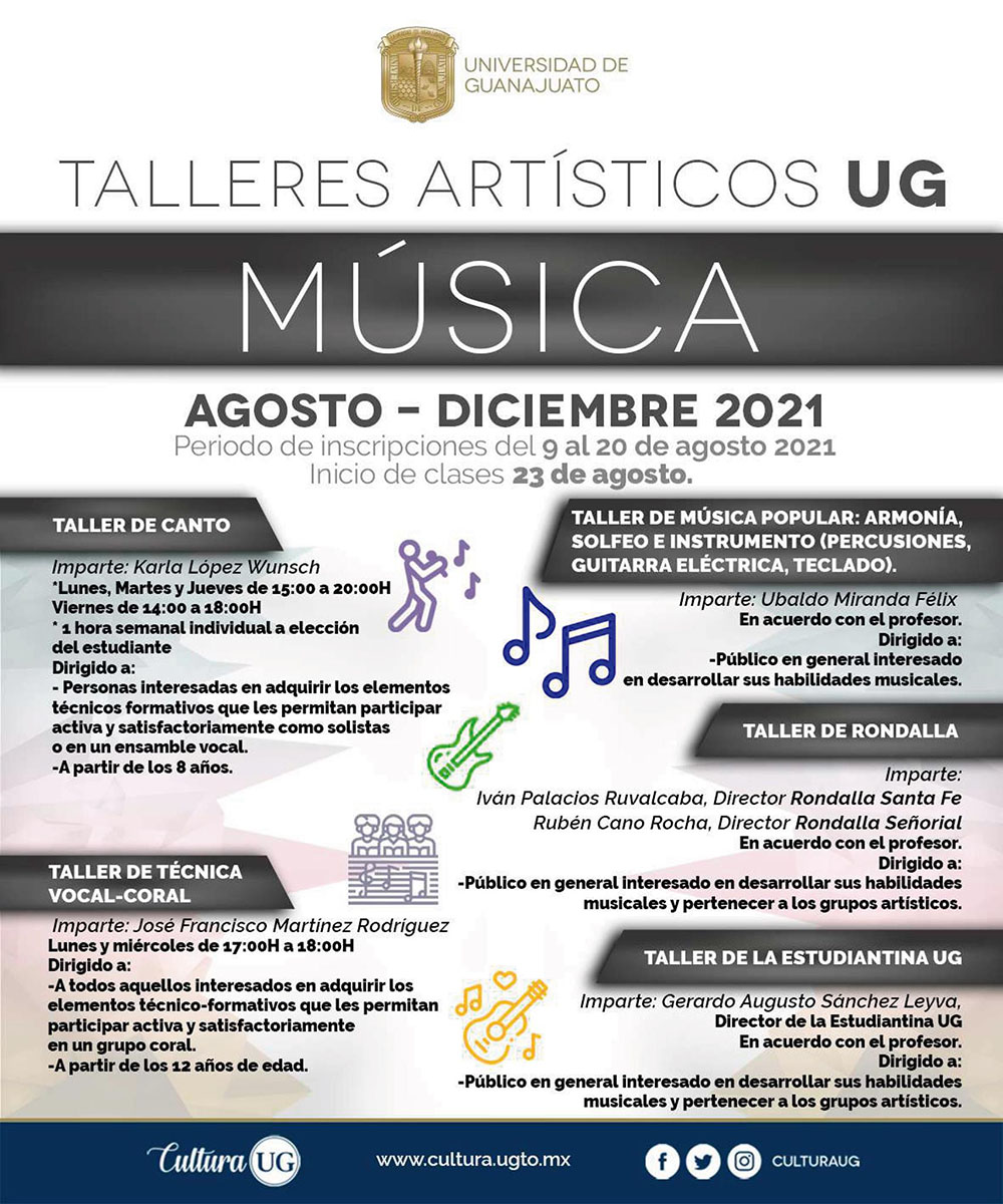 Guanajuato, Gto., 13 de agosto de 2021.- La Universidad de Guanajuato (UG) invita a disfrutar de las diversas actividades que la comunidad universitaria tiene preparada para amantes del cine, la música, el arte visual y en general del arte y la cultura.