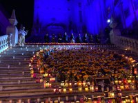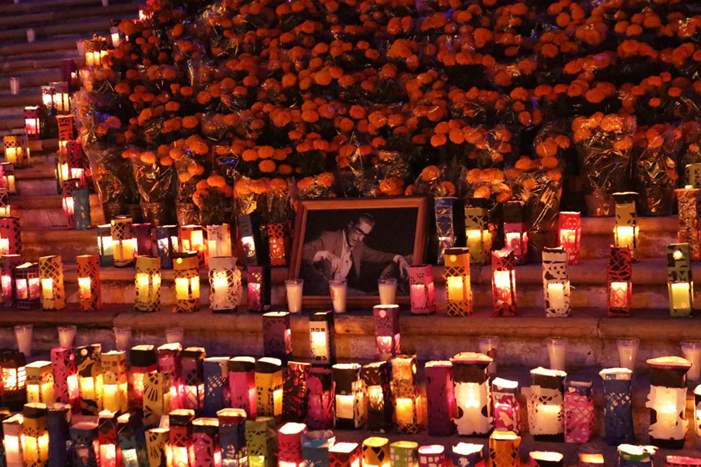 En cuanto a la simbología, detalló que el primer tramo de la escalinata se dedica al Sol y a la luz, al estar representados por un círculo de velas; y destacó el homenaje al Mtro. Eugenio Trueba, un pilar de la Casa de Estudios. En el segundo tramo se utilizan listones de colores que representan los colores funerarios de diversos países y que hacen alusión a las personas que han fallecido durante la pandemia; los colores del papel picado reflejan la diversidad cultural de México, pero también la unión de nuestro país, dijo el profesor Borja.
