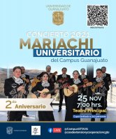 Para el Concierto 2021, se presenta el Mariachi Universitario del Campus Guanajuato en su 2° Aniversario el próximo 25 de noviembre a las 19 horas en el Teatro Principal, evento sin costo con cupo limitado a 210 personas, también se podrá seguir vía FB Live: @CampusGTOUG.