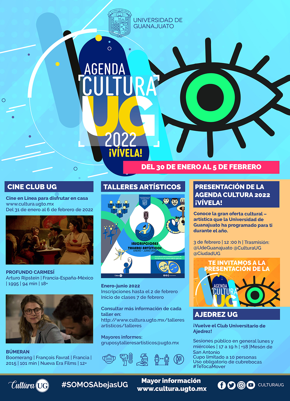 Guanajuato, Gto., a 28 de enero de 2022.- La Universidad de Guanajuato (UG, a través de la Dirección de Extensión Cultural, invita a conocer toda la oferta cultural y artística que esta Casa de Estudios tiene preparada para su comunidad y el público en general.