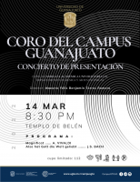 Dentro de la música coral se presentará el Concierto de Presentación con la Camerata Académica Universitaria del Departamento de Música y Artes Escénicas, bajo la dirección del Mtro. Félix Benjamín Torres Romero este 14 de marzo a las 20:30 horas en el Templo de Belén. Entrada libre.