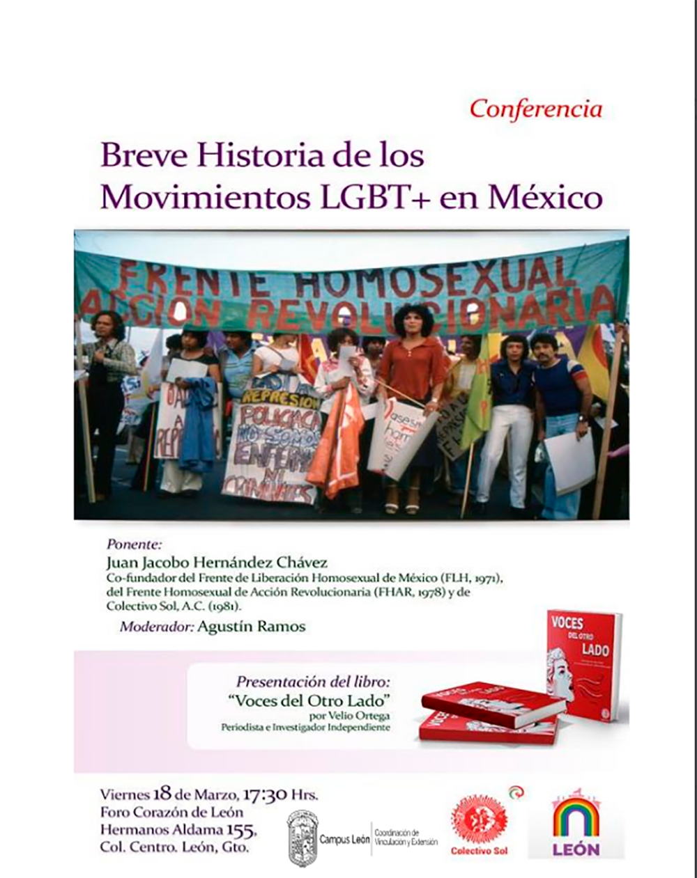 También se llevará a cabo la conferencia "Breve historia de los orígenes de los movimientos LGBT+ en México" presentada por Juan Jacob Hernández Chávez. Director de Colectivo Sol, AC. se realizará este 18 de marzo a las 17:30 horas en Hermanos Aldama 155, Zona Centro, León Gto