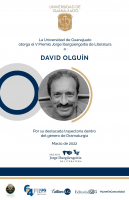 Los miembros del Jurado decidieron otorgar, de modo unánime, el Quinto Premio Jorge Ibargüengoitia de Literatura a David Olguín, figura clave en el teatro mexicano actual. Dramaturgo, director de escena, docente, tutor de la Fundación para las Letras Mexicanas en el área de Dramaturgia, merecedor de premios nacionales e internacionales. Académico de número en la Academia Mexicana de las Artes, formador de actores y directores. Su teatro es vasto en temas, significados y referencias, ha explorado la existencia humana a través de la escritura para la escena. Su obra, compleja en sus exploraciones del final del siglo XX y las primeras décadas del XXI, está publicada, traducida y representada tanto en México como en el extranjero y constituye una de las plumas creativas más coherentes en su desarrollo. David Olguín, un verdadero hombre de teatro, ha desarrollado una visión de la naturaleza misma del teatro, las implicaciones de la representación y la potencia desestabilizadora en las relaciones de ficción y realidad.