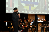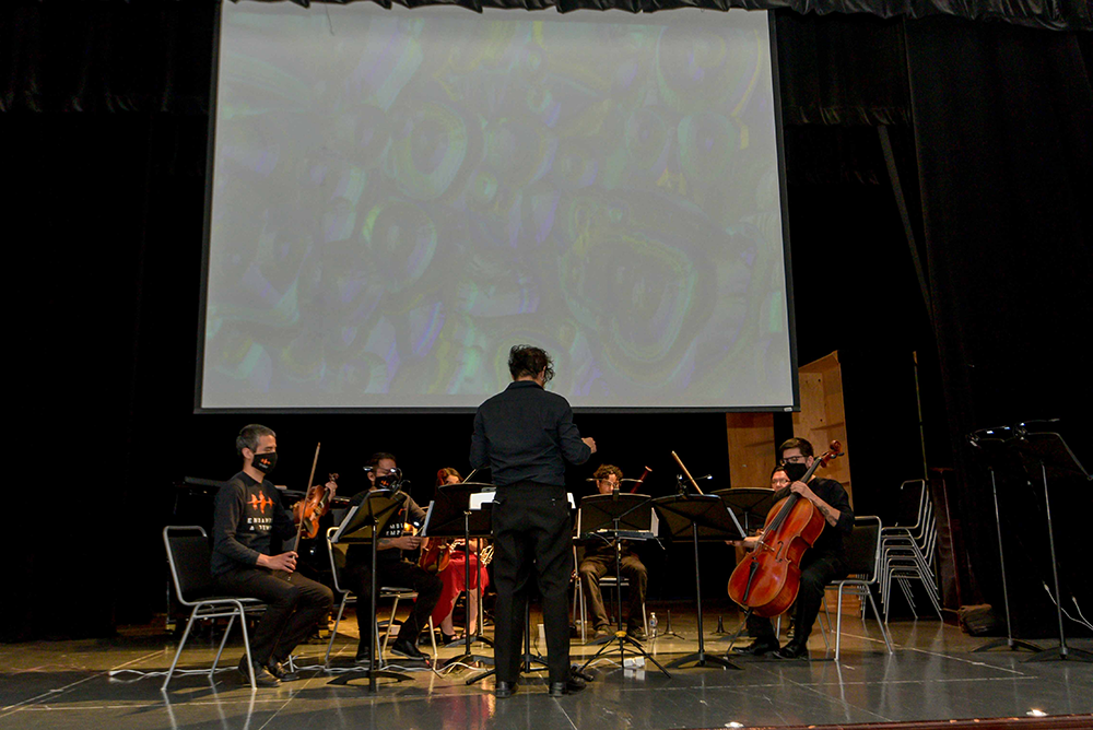 La presentación del ensamble mostró la proyección de abstractos y versátiles visuales, que se proyectan en pantalla al compás de la música, creación de un joven talento que es parte de esta agrupación.