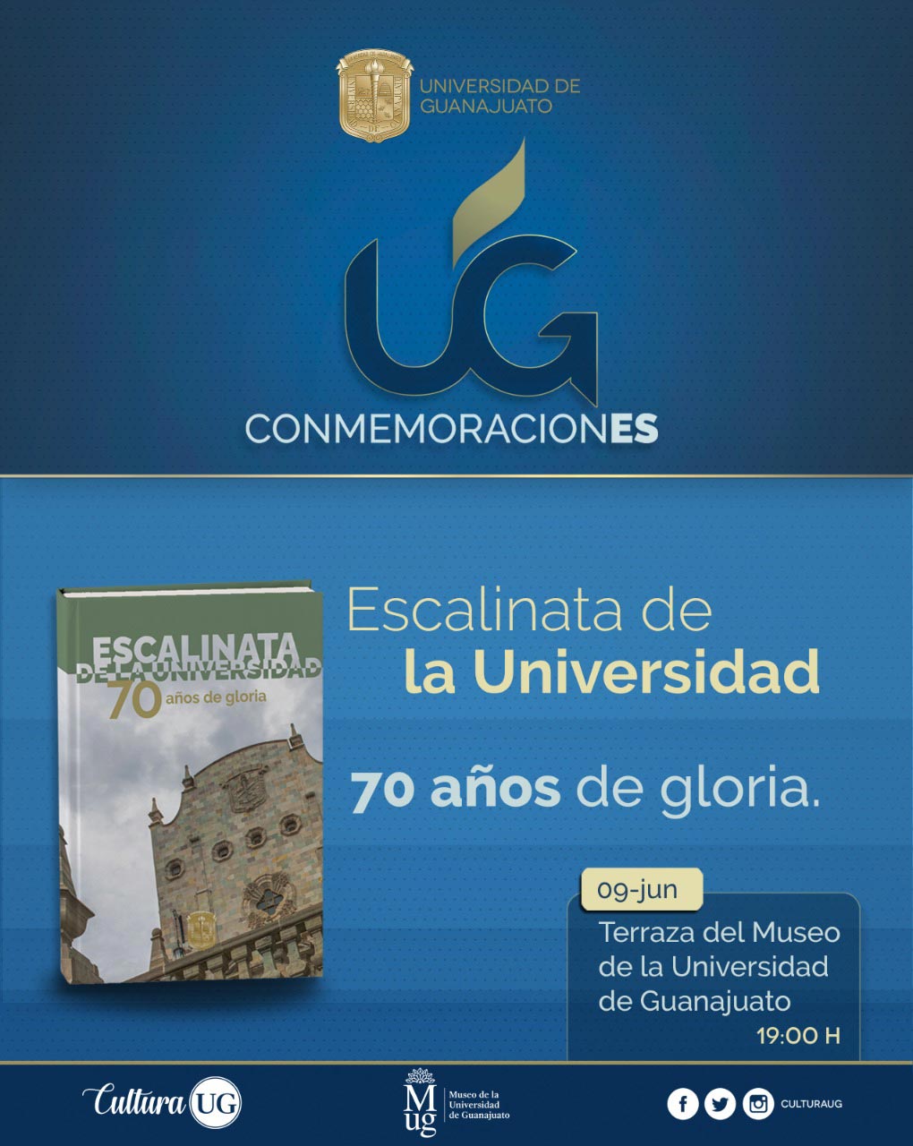 Dentro de una colección de libros que comparten la historia universitaria, se presentará la obra literaria "Escalinata de la Universidad, 70 años de gloria" este 9 junio a las 19:00 horas en la Terraza del Museo de la Universidad de Guanajuato. Entrada libre.