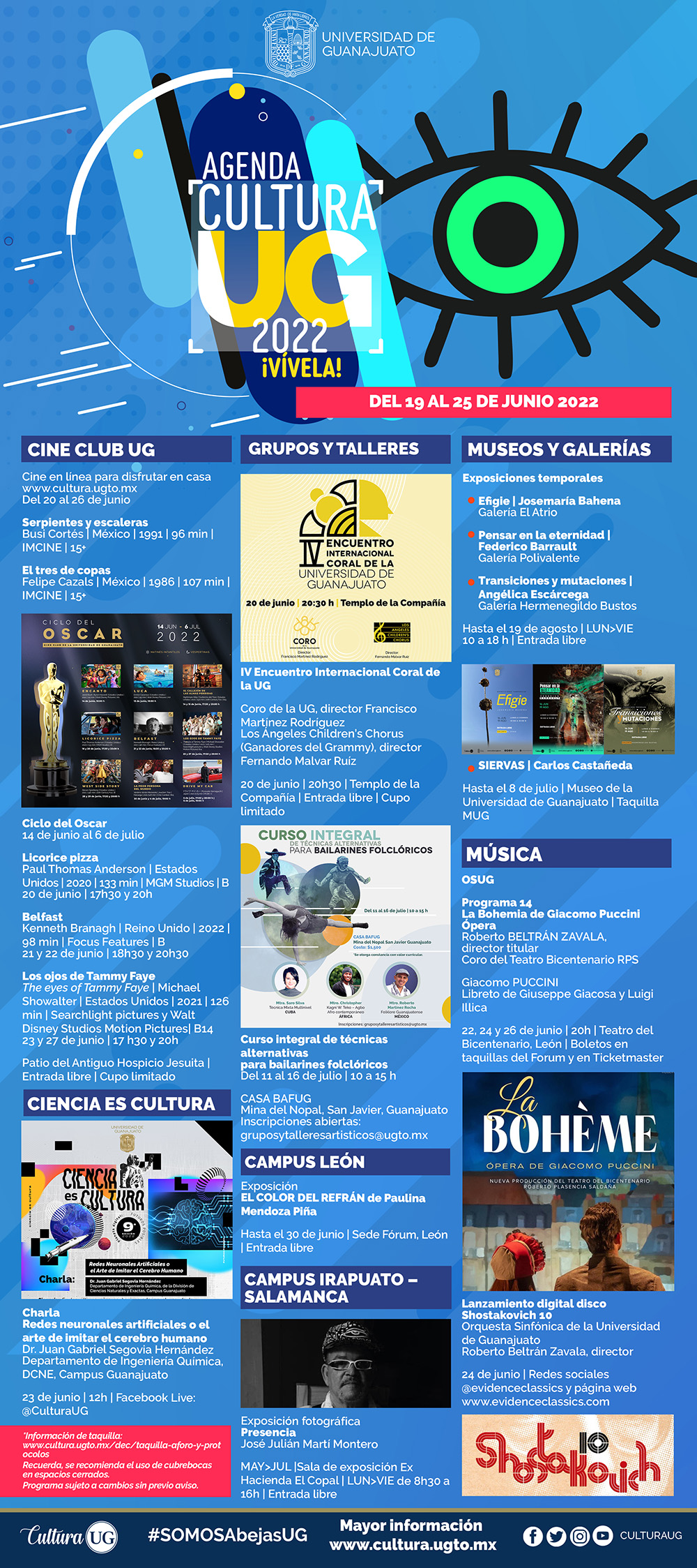 Guanajuato, Gto., a 17 de junio de 2022.- La comunidad artística de la Universidad de Guanajuato (UG) tiene preparada grandes actividades semanales en sus diversas sedes universitarias, las cuales van desde presentaciones, lanzamientos mundiales, encuentros internacionales; todo, con un eje cultural de calidad que representa a la casa de estudios.