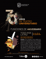 Para iniciar, en el marco de la conmemoración de los 70 años del Teatro Universitario, se llevará a cabo la presentación de la obra "Todo por la paz" bajo la dirección del maestro Hugo Gamba Briones. Las funciones serán el 20, 21, 28 y 29 de septiembre a las 20:30 horas en el Teatro Principal de la ciudad de Guanajuato.