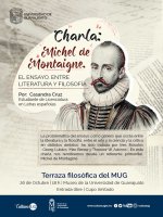 Las Terrazas Filosóficas del Museo de la UG siguen su marcha con la estudiante de la Licenciatura en Letras Españolas Cassandra Cruz quien impartirá la charla: "Michel de Montaigne. El ensayo entre literatura y filosofía", la cual tendrá lugar el 26 de octubre a las 18 horas, entrada libre con cupo limitado.